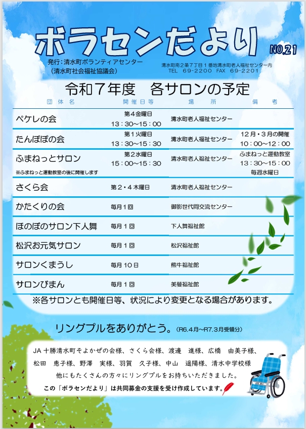 volunteer_topics ボランティア ボラセンだよりの発行 令和7年度各サロンの予定です。 サロンに参加してみてください♬ 前の投稿 次の投稿 ボランティアの一覧2025年11月 (1)2025年4月 (1)