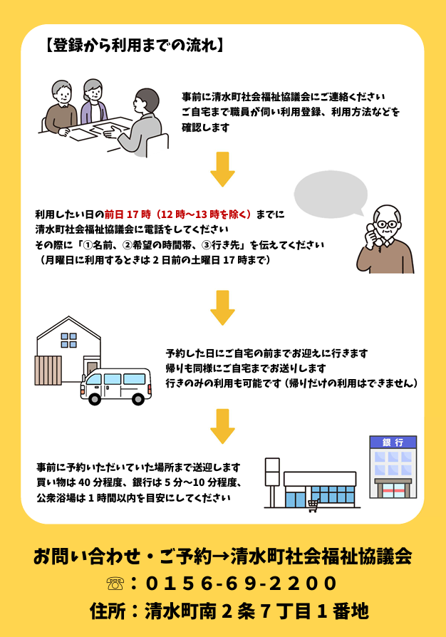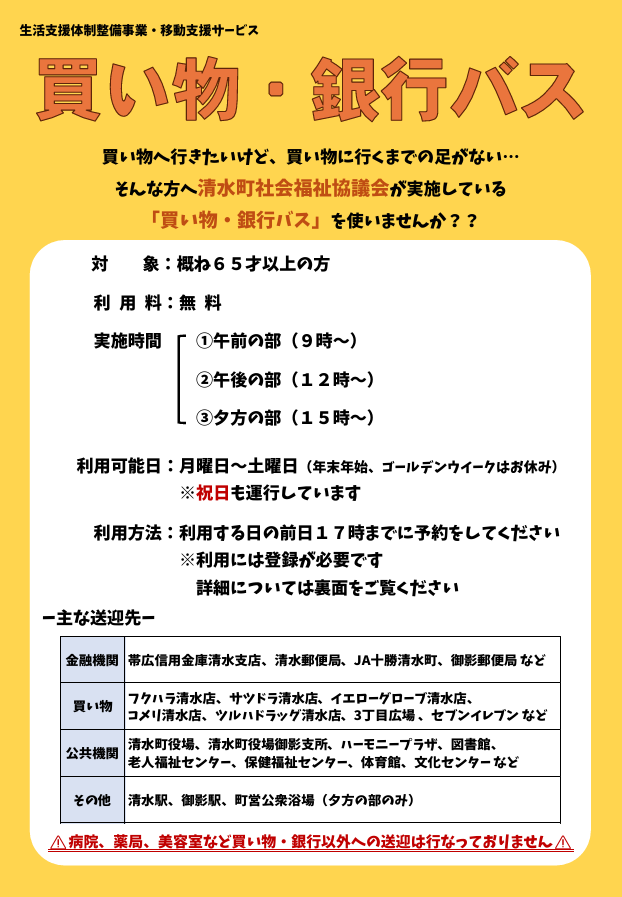 senior高齢者 買物・銀行バス 免許証の返納や自家用車を手放した65歳以上の町民を対象に送迎事業を行っています。 ご利用希望の方は清水町社会福祉協議会までお問い合わせください。 ふれあい昼食会 ふまねっと運動教室 パークゴルフ大会 地域交流サロン 小地域ネットワーク事業 給食サービス 移送サービス 買物・銀行バス 生活支援コーディネート事業 清水町老人クラブ連合会